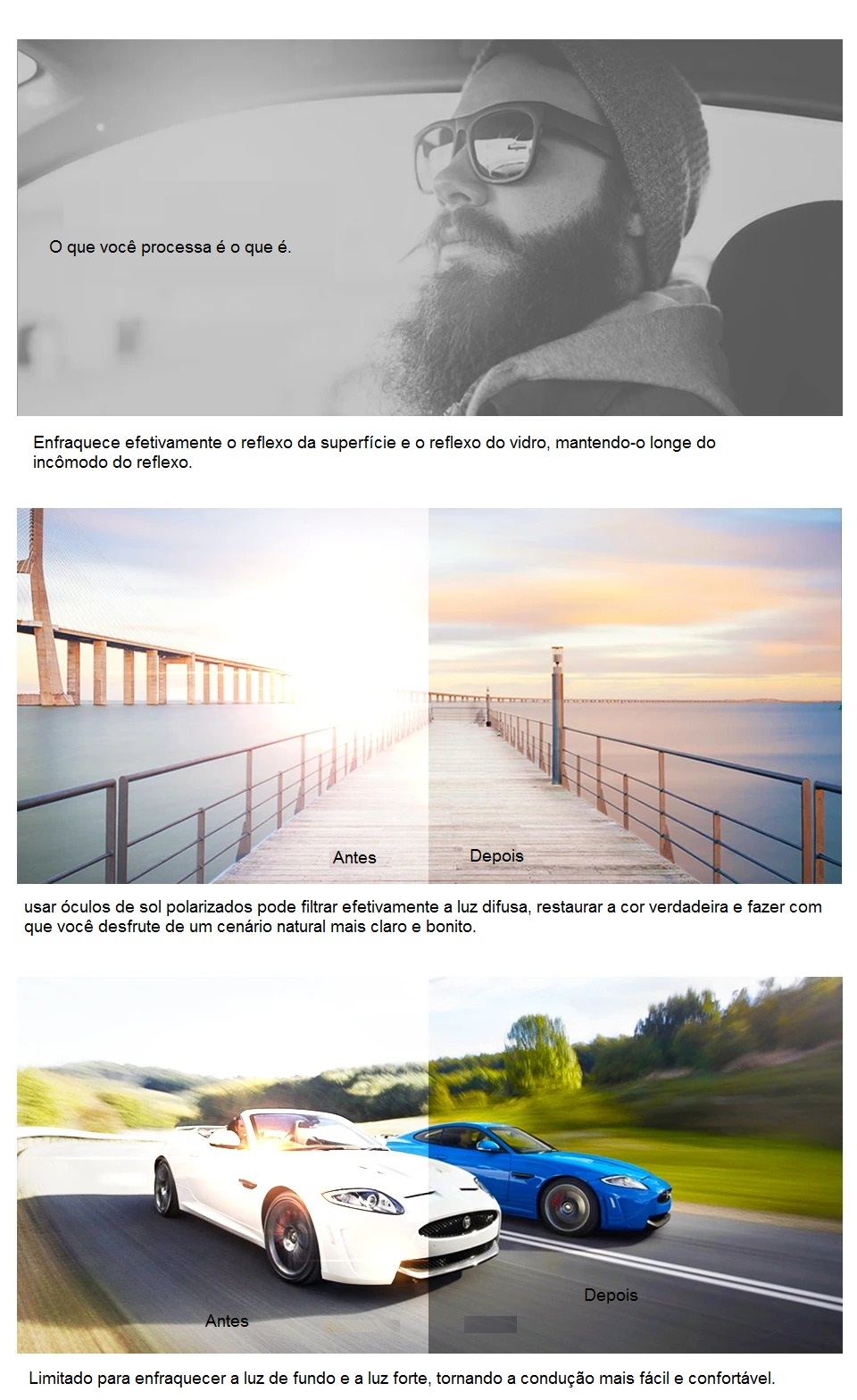1. **Redução de Reflexos**: Os óculos polarizados ajudam a reduzir o brilho e os reflexos de superfícies como água e estradas, proporcionando uma visão mais clara e confortável. Isso é especialmente útil para melhorar a segurança durante a condução.
