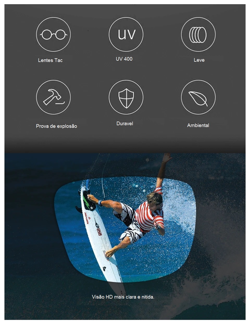 5. **Durabilidade e Proteção**: Além de estiloso, um bom par de óculos polarizados geralmente oferece proteção UV, protegendo os olhos contra os raios nocivos do sol.